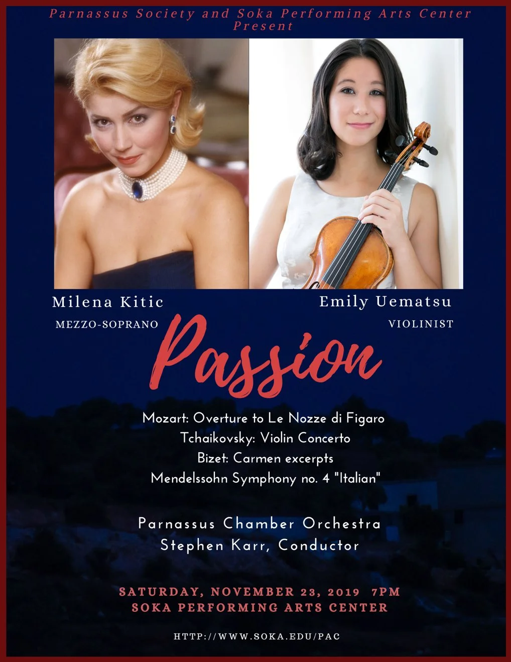 Throughout the years, Parnassus Society has delighted in producing concerts that bring together world-class artistry and community spirit. From intimate recitals to grand operatic productions, we seek to contribute to the cultural landscape of Orange County, offering audiences experiences that inspire, uplift, and connect. At the heart of our mission is a belief in the transformative power of the arts as something essential —a force that deepens understanding, nurtures compassion, and reminds us of our shared humanity.