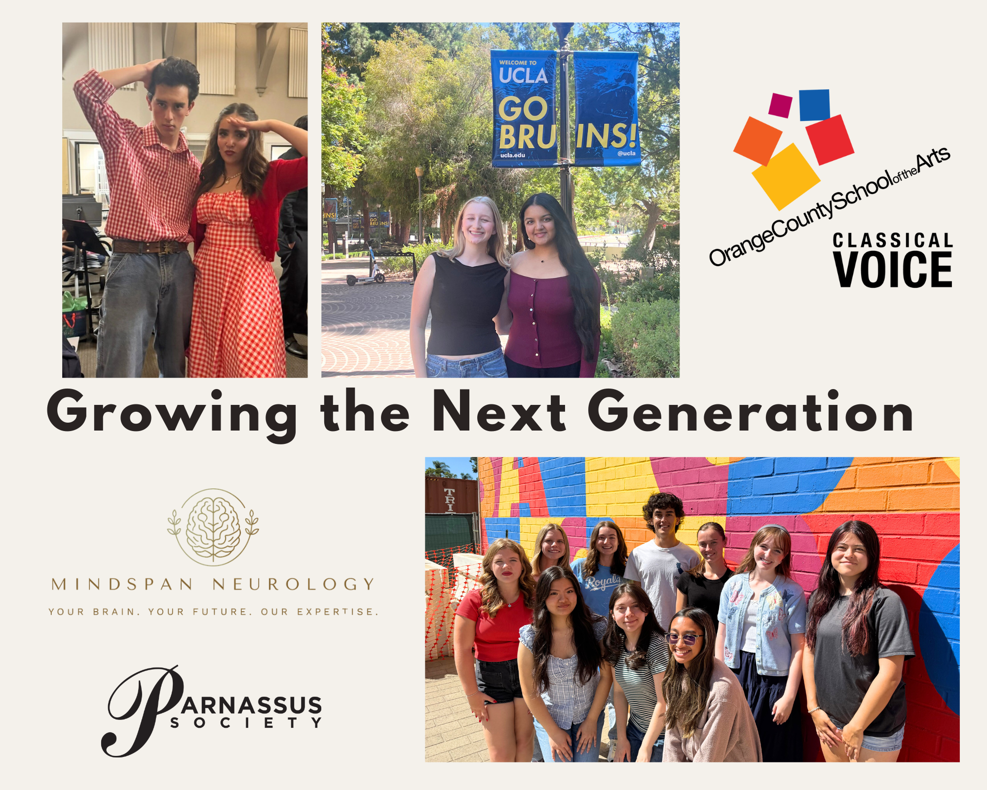 Parnassus Society offers two innovative internship programs bridging music, science, and community. The Mindspan Neuroscience–Parnassus Collaboration engages college students who majors in Neuroscience or Music Performance—in research and performance projects exploring music’s impact on dementia and Alzheimer’s. The Parnassus–OCSA Internship Program, now in its second season, gives high school students from Orange County School of the Arts, Classical Voice Conservatory, hands-on experience in marketing, social media, rehearsals, and concert support: cultivating the next generation of creative leaders.