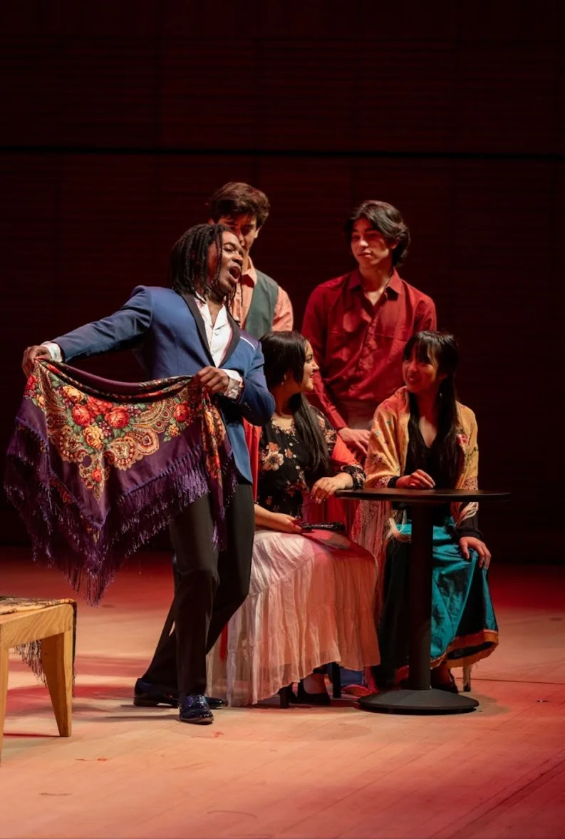Actors performing on stage with a dark background, one man holding a floral shawl, and four other actors seated or standing nearby.